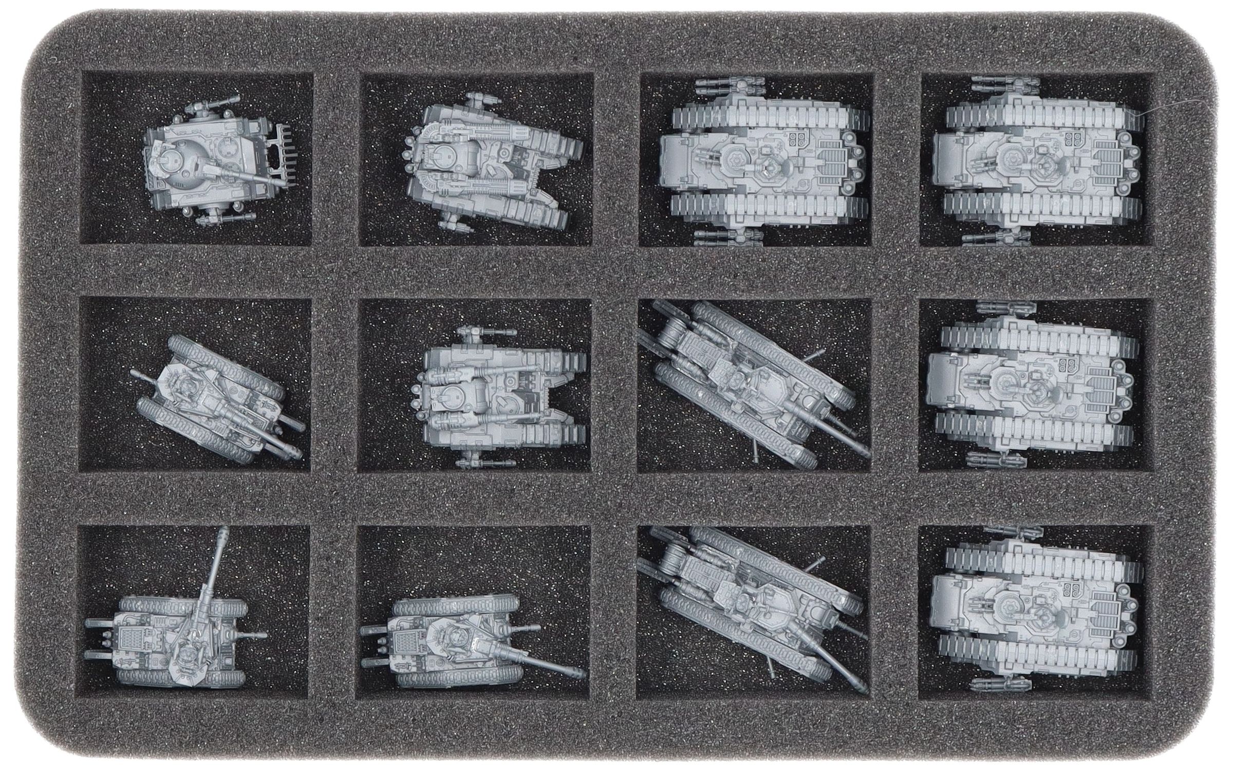 This Feldherr foam tray provides space for up to 12 miniatures of your army, perfectly suited for storing tanks like Spartan Assault Tank, Sicaran, Predator, Leman Russ, and Malcador Battle Tanks, as well as miniatures with similar dimensions.