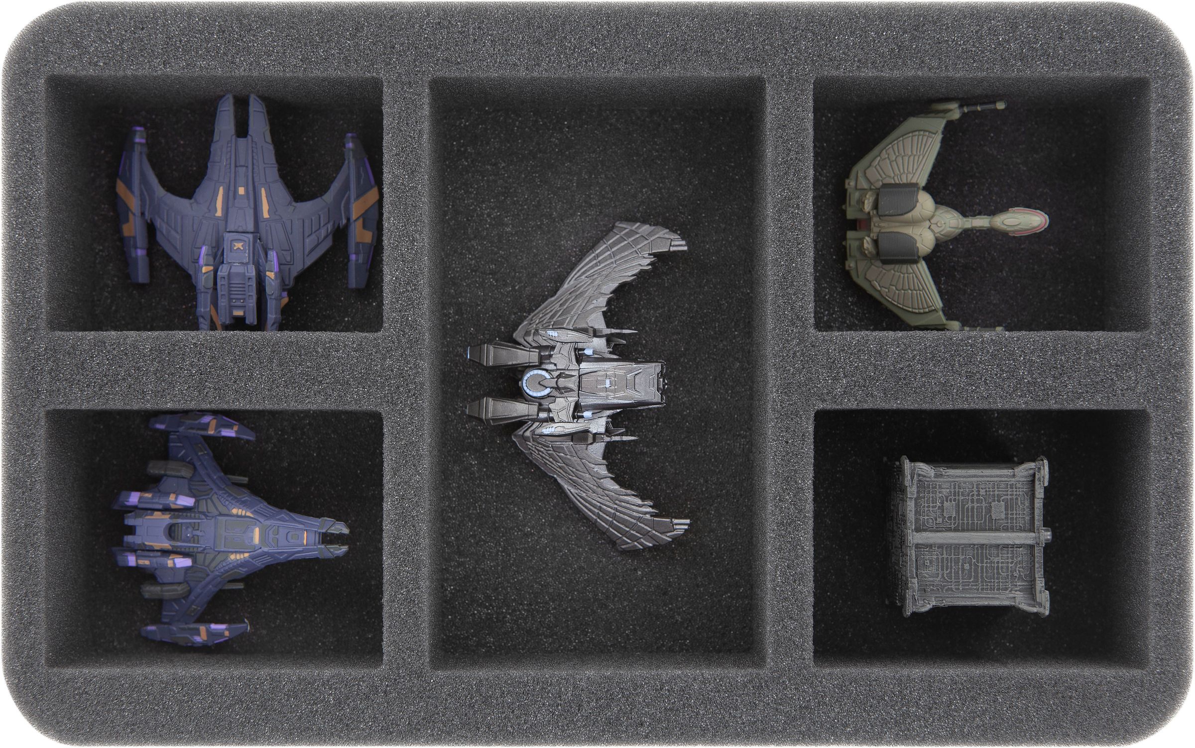 This foam tray has 5 compartments for the safe and orderly storage of medium-sized Star Trek Attack Wing models. The fine-pored foam provides the best possible protection against damage – delicate parts like wings remain unharmed, surfaces remain intact.
