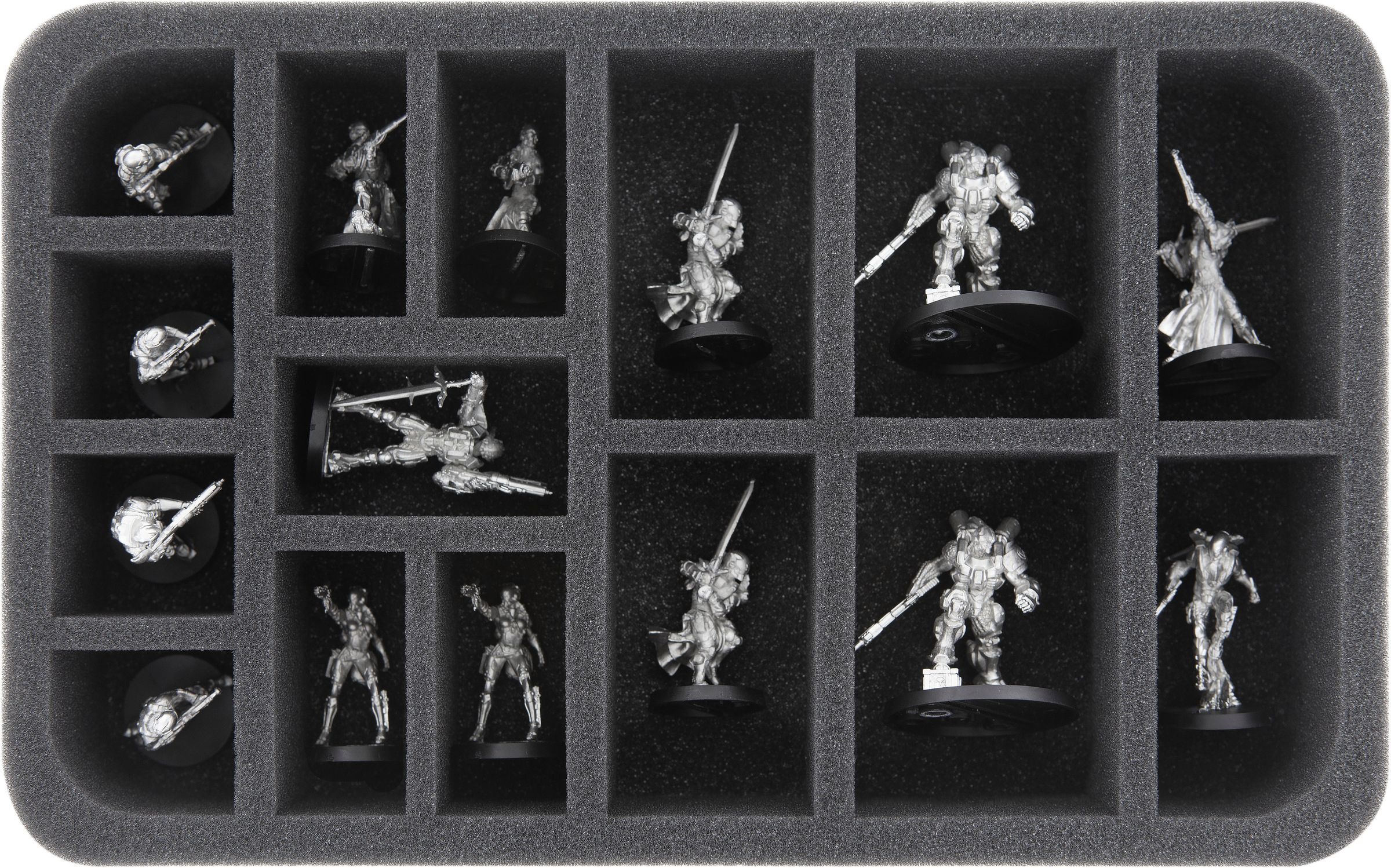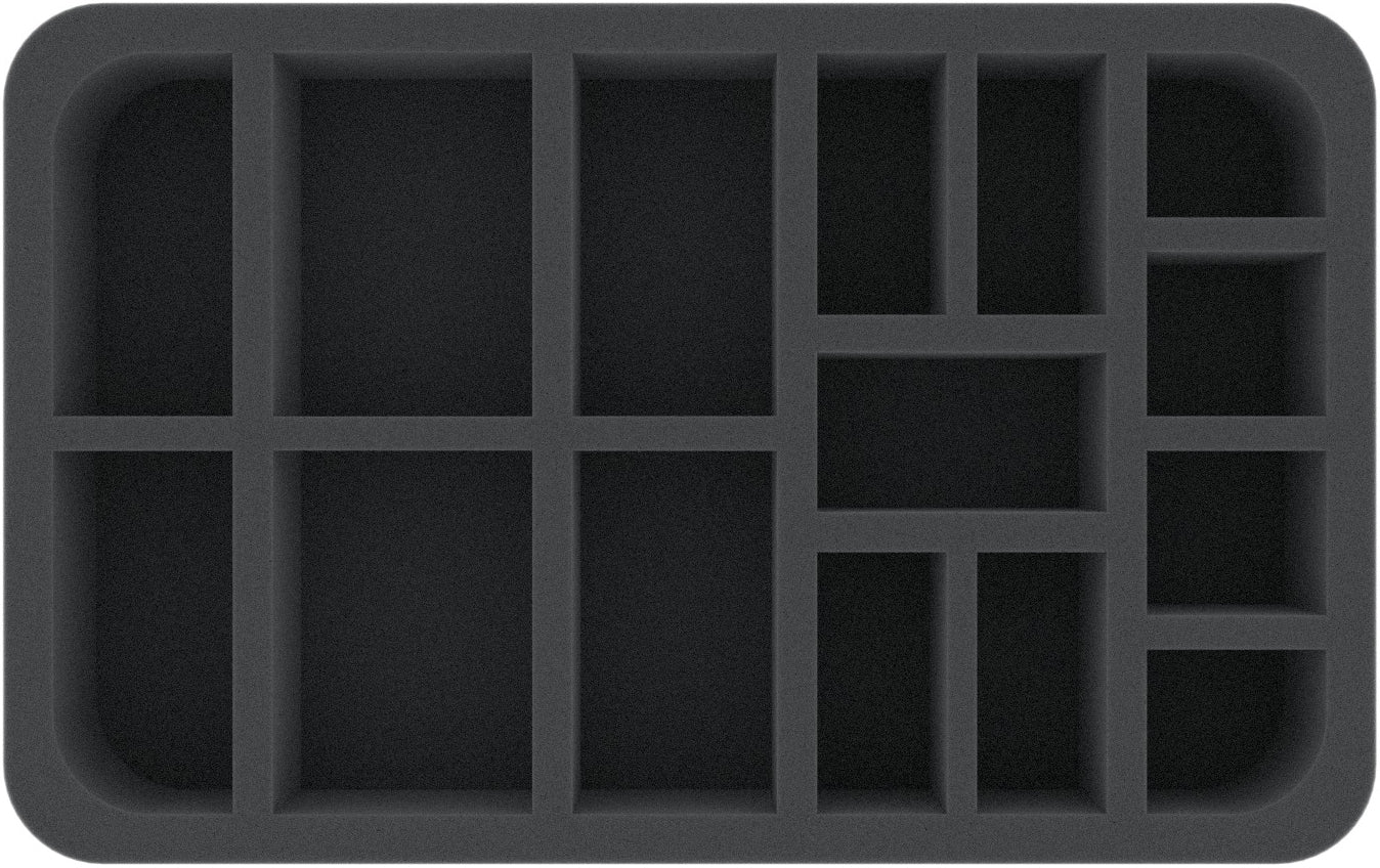 This Feldherr foam tray features 15 compartments for the safe and orderly storage of "Infinity The Game" miniatures. 4 compartments will hold models on 40 mm bases, 11 compartments are suitable for models on 25 mm bases. The fine-pored foam reliably protects your miniatures from damage – fragile parts remain intact, the color of painted models remains unharmed.