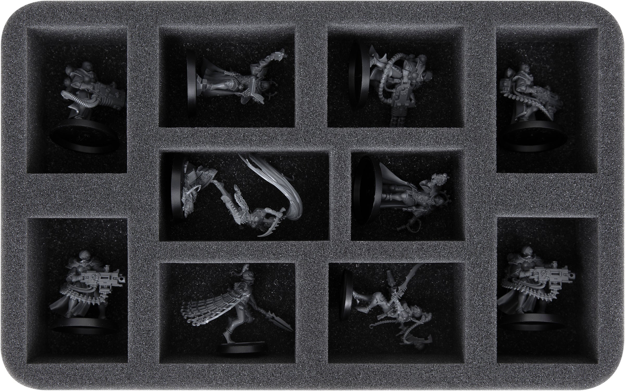 On this Feldherr foam tray you have space for up to 10 miniatures of your army. The insert is particularly suitable for storing infantry like the Wyches, or character models like Drazhar or Grotesque.