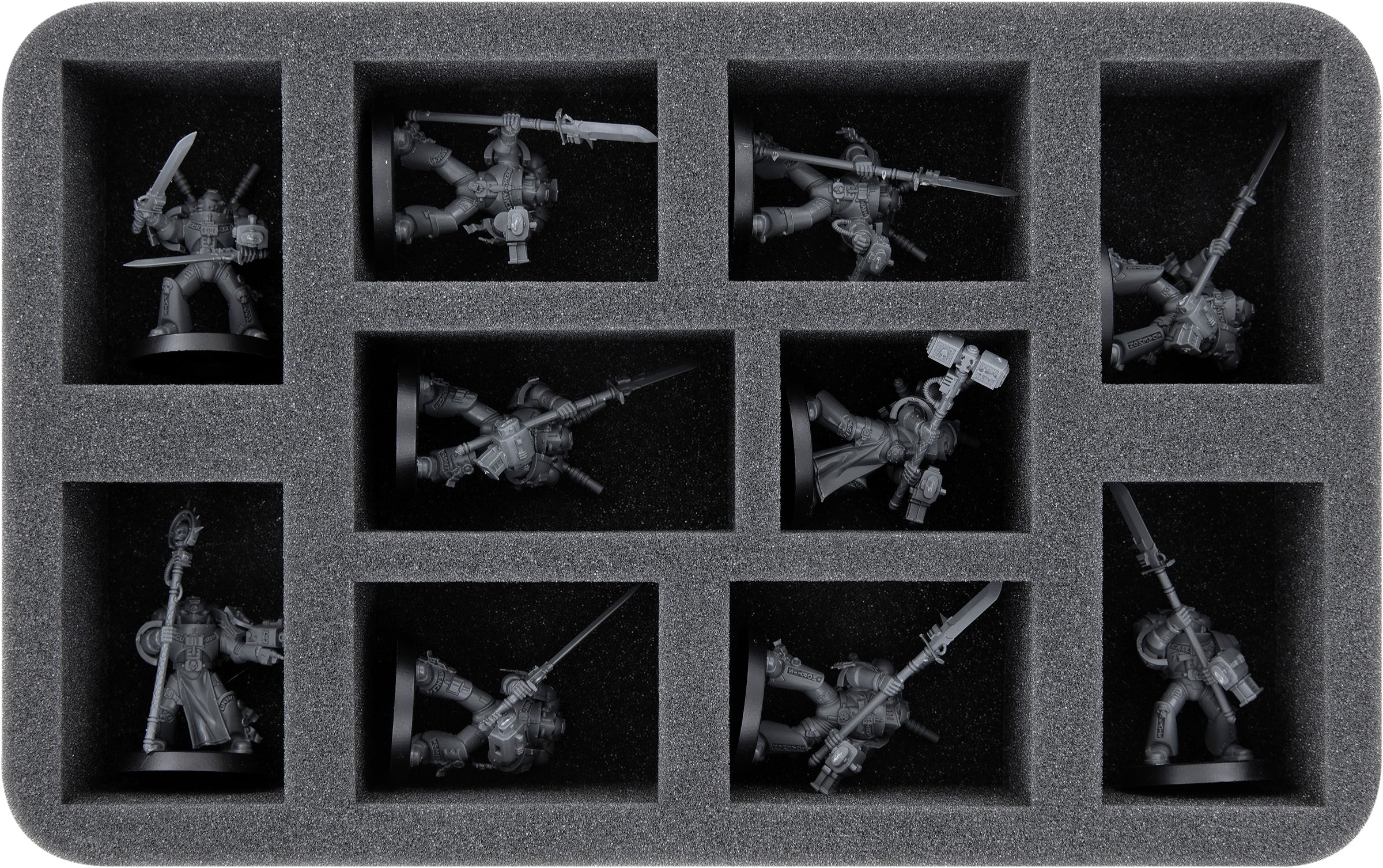 This Half-Size foam tray is divided into 10 compartments. The compartments of four different sizes are ideal for storing larger or wider models of your Space Marines neatly and securely. It is particularly suitable for the Grey Knights Strike Squad, for example. Models with the dimensions of a Primaris Captain, Primaris Lieutenant, a Chaplain, or Assault Intercessors are also in good hands here.