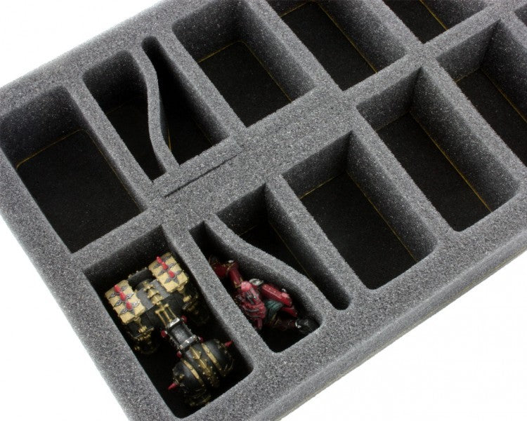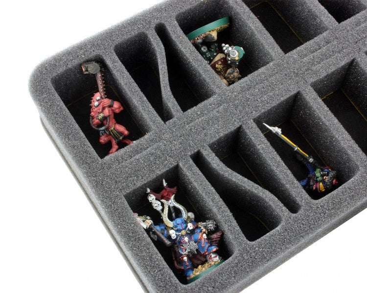 For slightly larger models - based on 28 mm tabletop systems. The tray is ready to use - glued 10 mm foam base. ​The 50 mm depth of the foam is result from 10 mm foam base and slot foam tray with 40 mm effective depth.