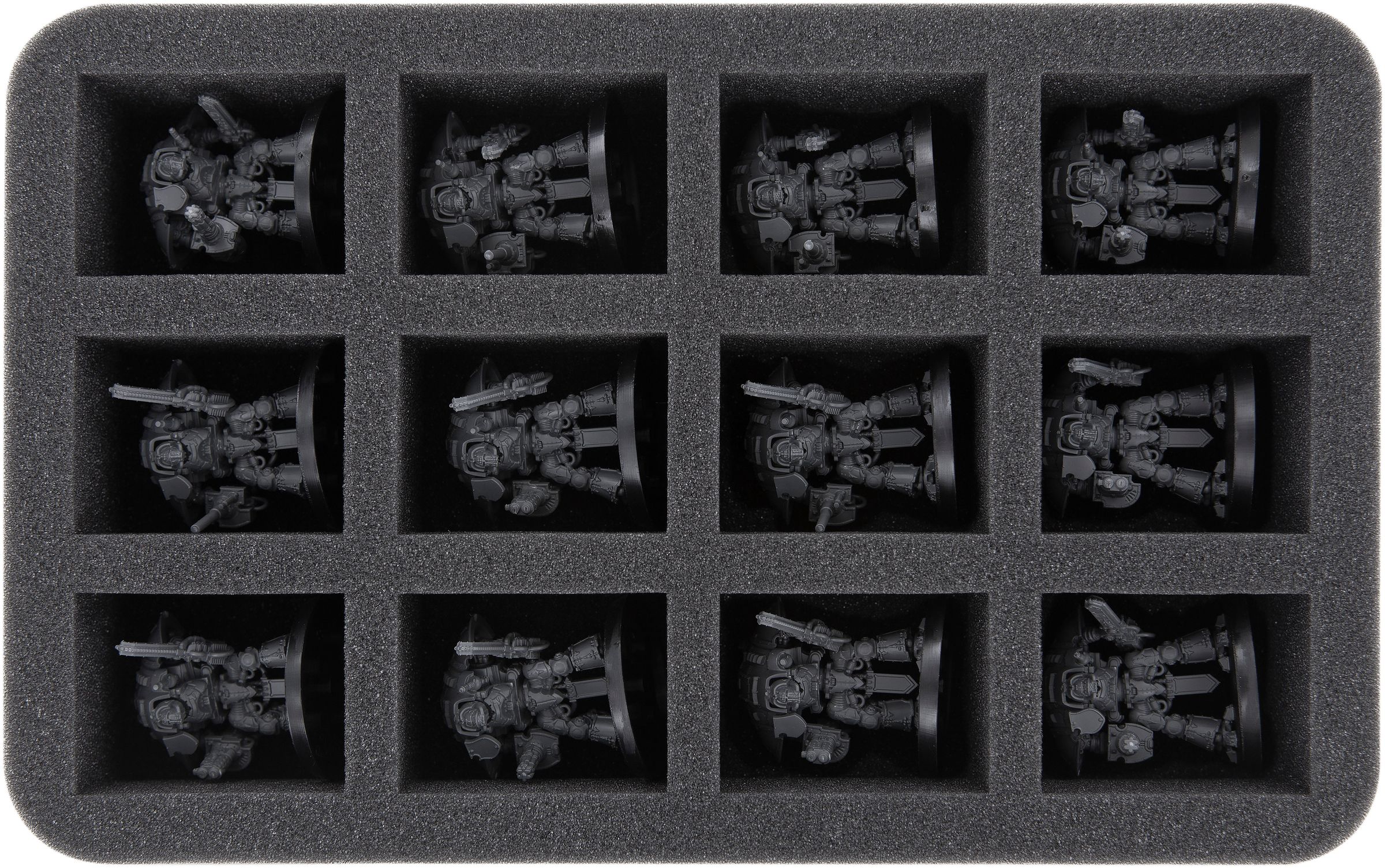 This Half-Size foam tray is divided into 12 individual compartments. It offers a safe place for up to 12 Questoris Knights of the Adeptus Titanicus. The miniatures are stored in individual compartments and the soft foam ensures that the miniatures are optimally protected from damage. The colors of painted models are preserved.