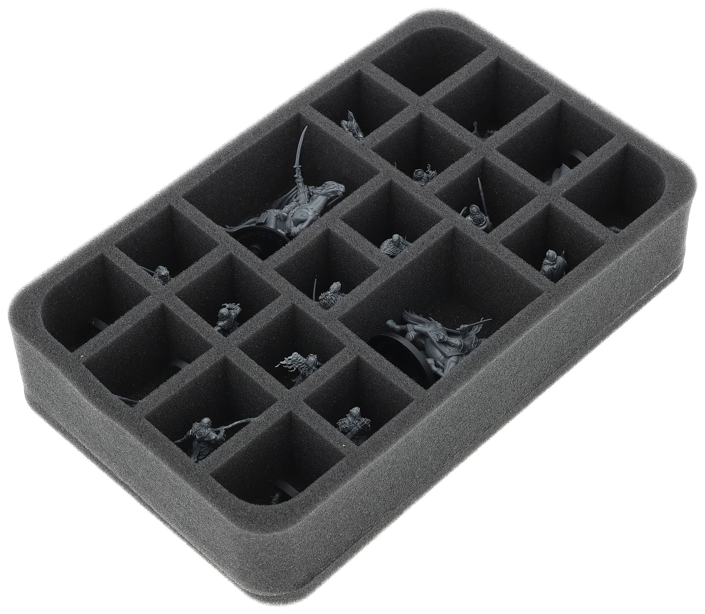 On this Feldherr foam tray you have space for up to 20 miniatures of your army. The insert is especially suitable for storing the Háma, Prince of Rohan mounted on a horse, General Targg mounted on a horse, Hill Tribesman, Warriors of Rohan and similar sized models.