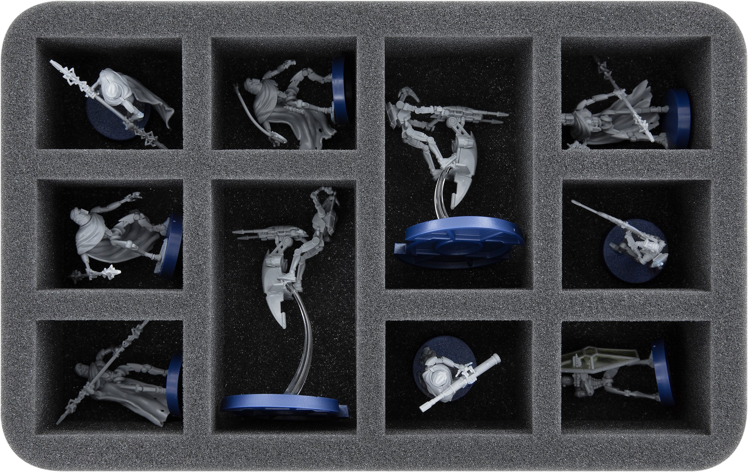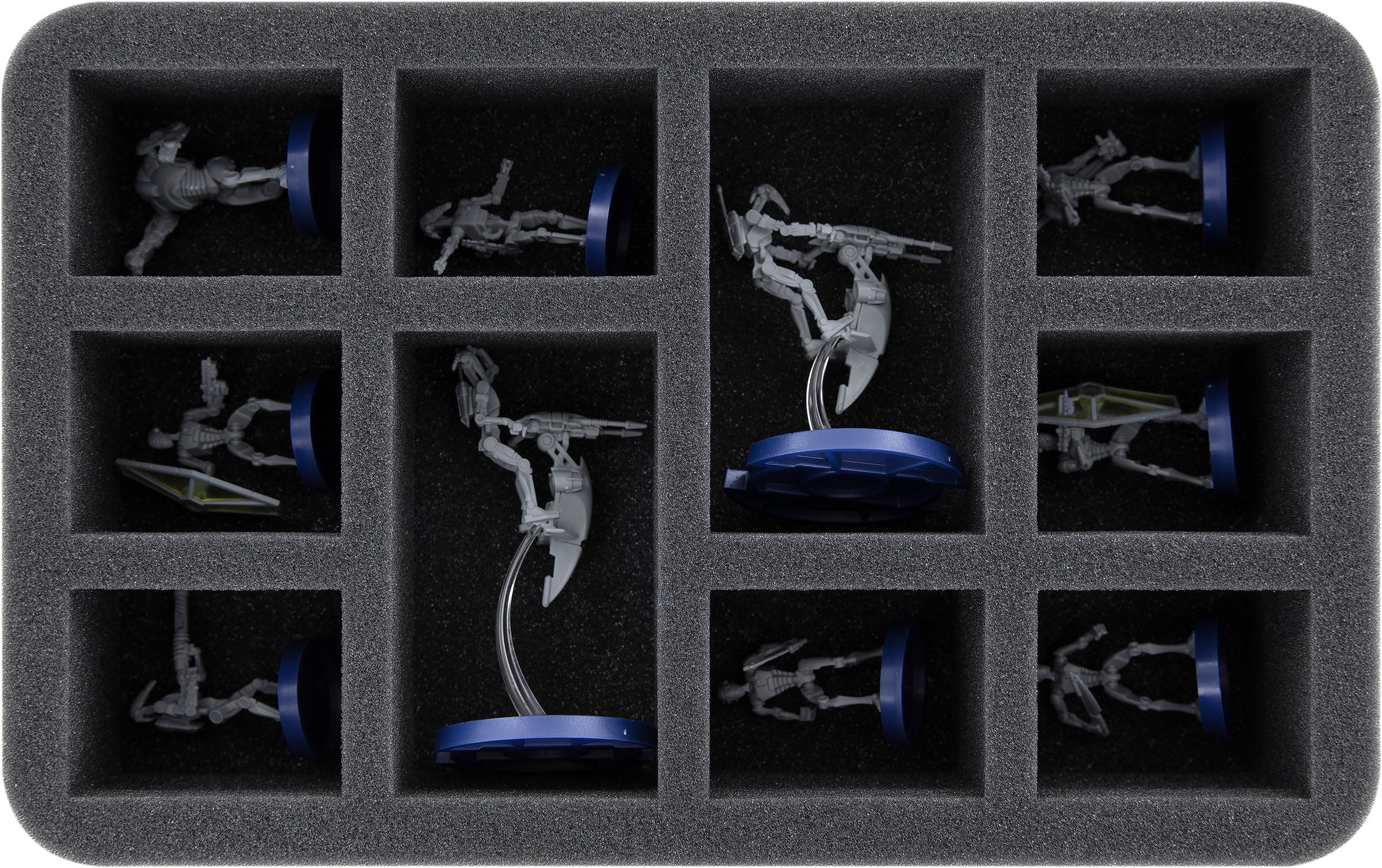 On this Feldherr foam tray you have space for 10 miniatures. The insert is ideal for storing two STAP Riders and 8 standard infantry units, such as troopers, B1 Battle Droids, or similarly sized miniatures. The IG-100 Magnaguards are very welcome here, too.