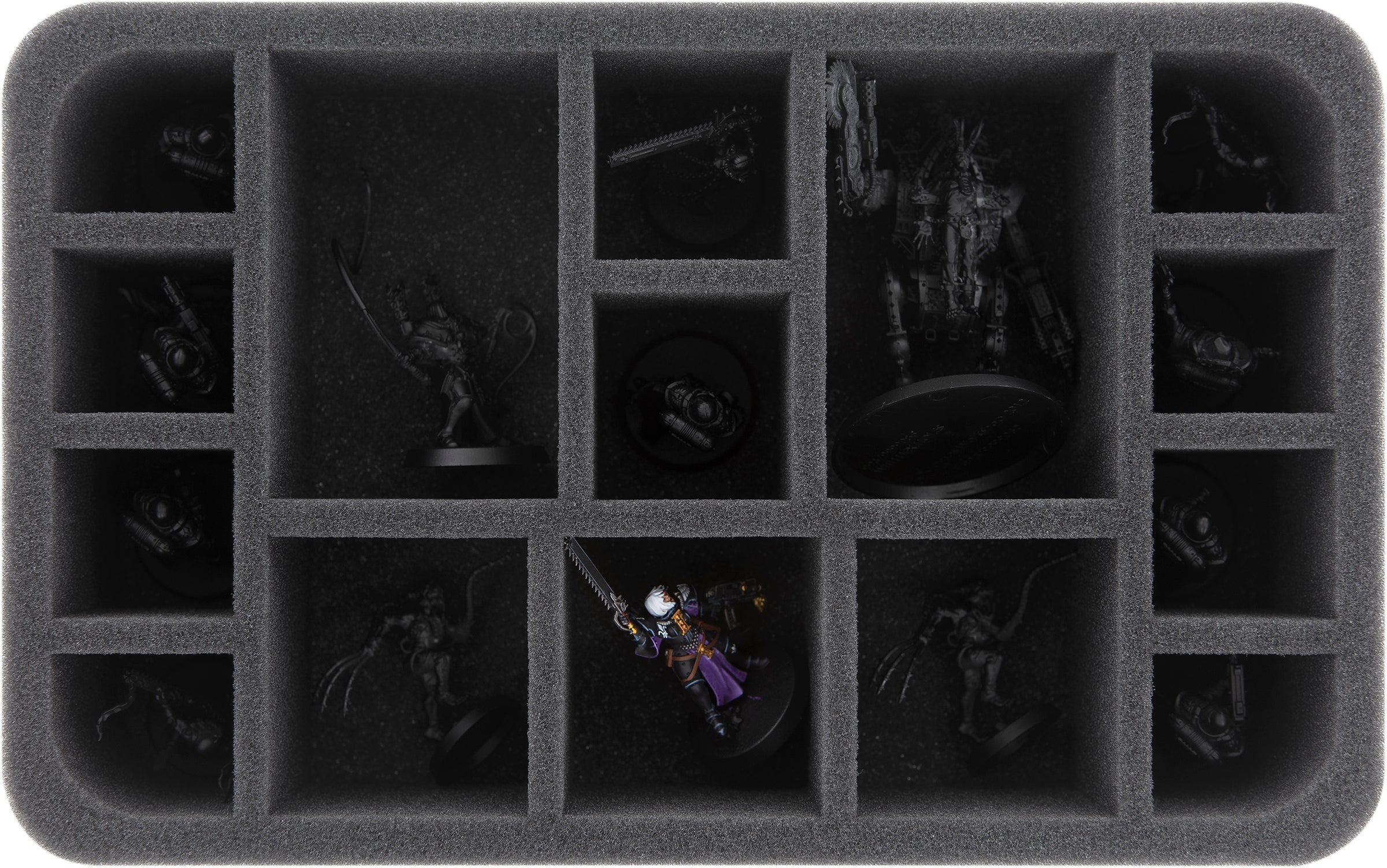 With its 15 compartments of different sizes, this Half-Size foam tray is ideal for keeping medium-sized miniatures and standard units of the Adepta Sororitas clear and well protected.