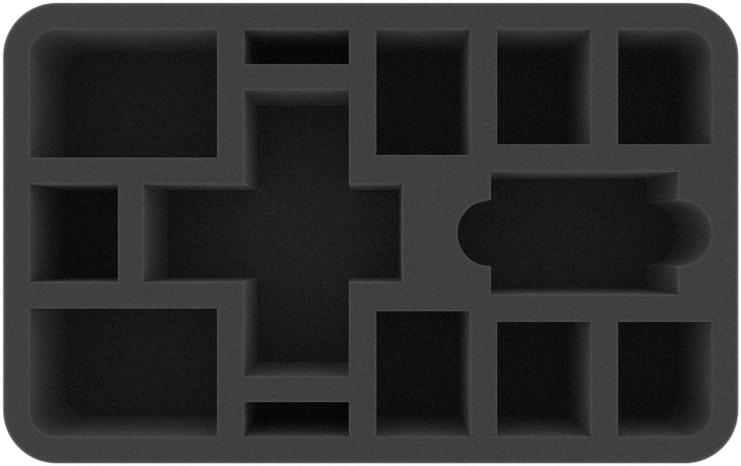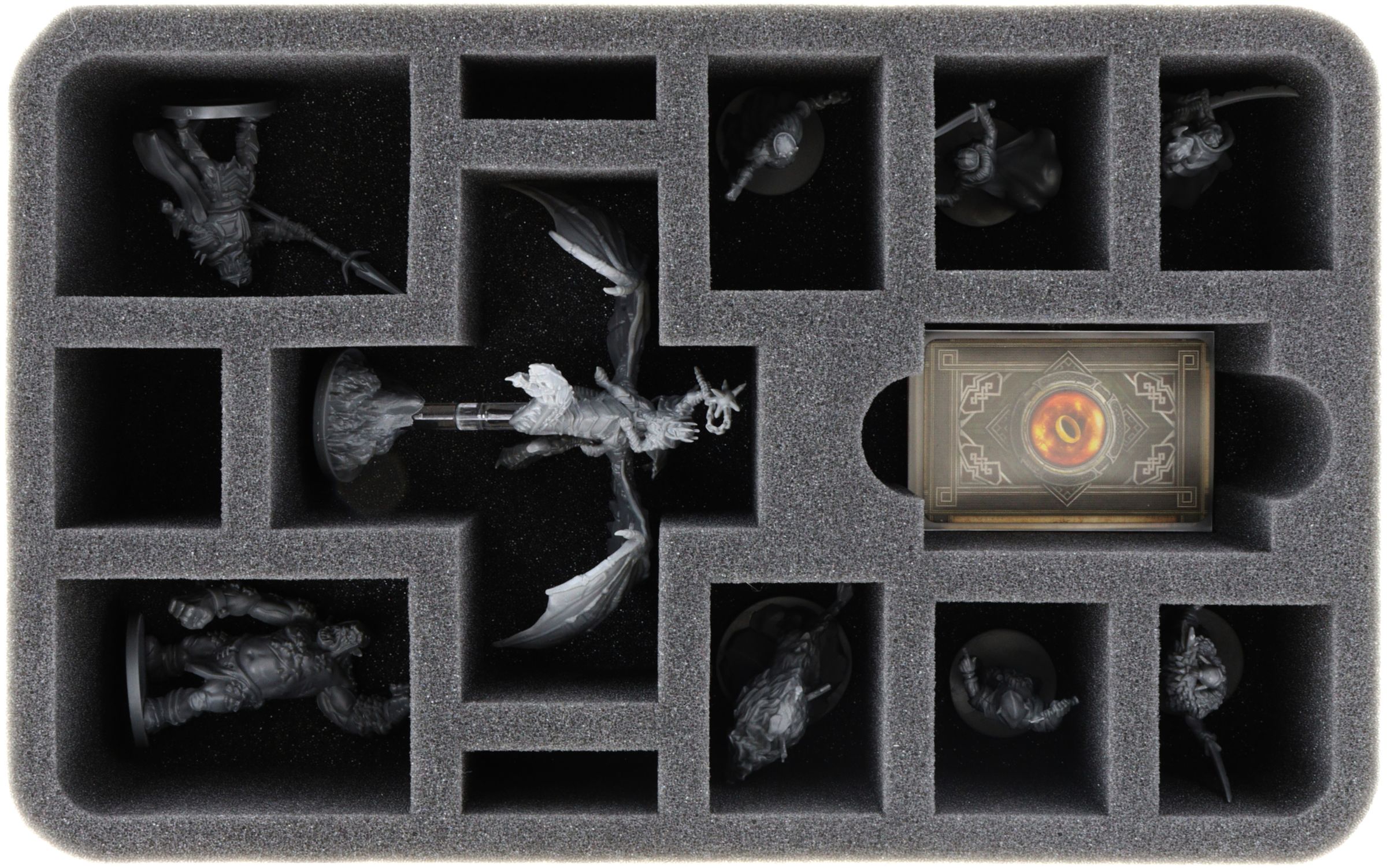 This 70 mm high foam tray is divided into 13 compartments. Whether the Witch King or Golgotar, each miniature gets its own compartment. The custom-fit cut ensures the figures have a firm seat and do not slip during transport. The soft foam reliably protects sensitive details from damage. The colors of painted figures are also safe, as the foam prevents abrasion of the colors and scratches.
