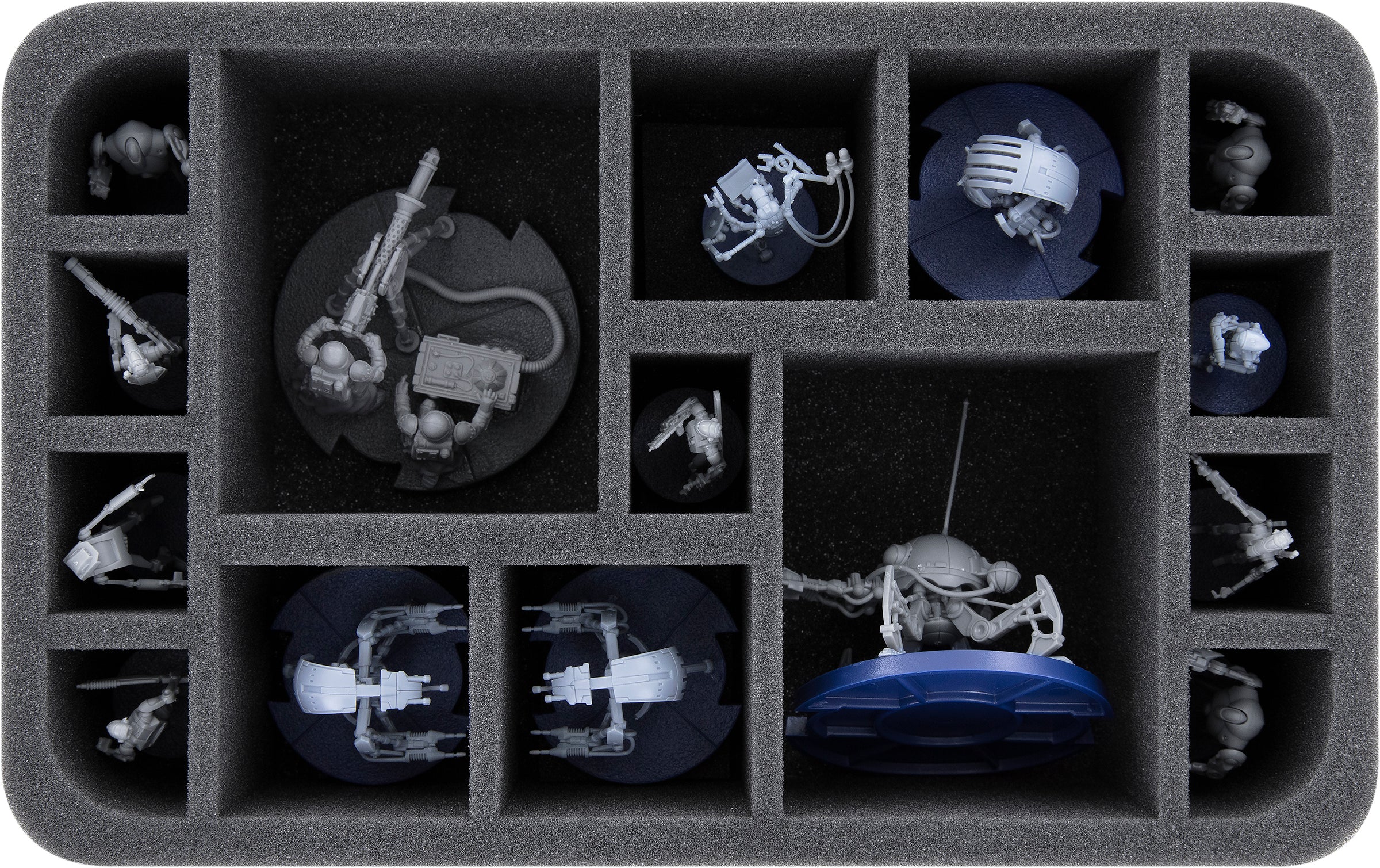 With this Half-Size insert, up to 15 Star Wars: Legion miniatures get a safe shelter. The insert offers 2 compartments for large figures (e.g. DSD1 Dwarf Spider Droid), 4 compartments for medium-sized miniatures (e.g. Droidekas), 9 compartments for standard infantry (e.g. B1 Battle Droids, troopers).