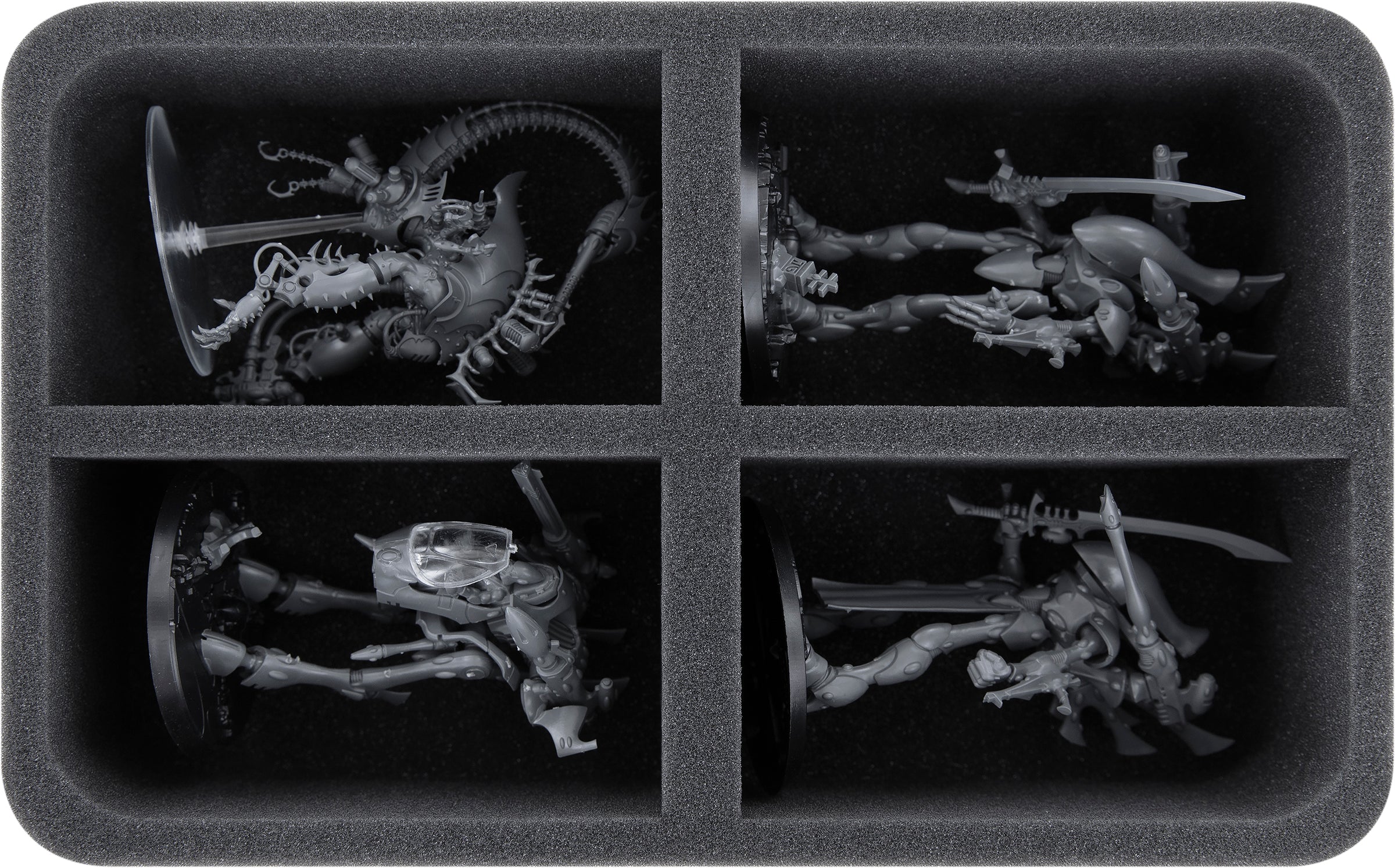 On this Feldherr foam tray you have space for up to 4 miniatures of your army. The insert is especially suitable for storing the Wraithlord, War Walker, Cronos and similar sized models.