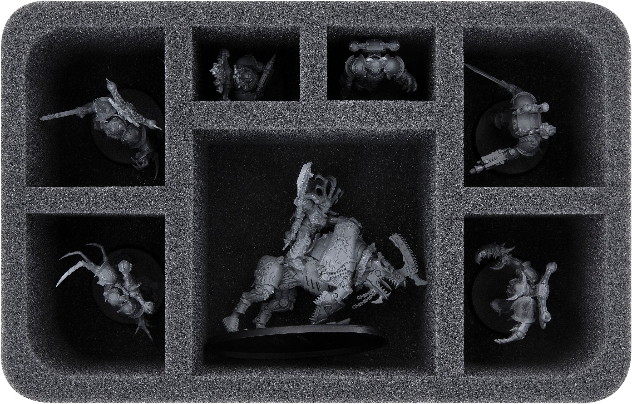 This half-size foam tray features seven different-sized compartments, one large square compartment, four medium-sized compartments, and two smaller rectangular ones. Stow the Eightbound, or its variant, the Exalted Eightbound, in the four medium-sized compartments. You use the large compartment for either a Hell Slayer or a World Eaters Chaos Lord on Moloch or Lord Invocatus. In the smallest compartments, you have space for Khorne Berserkers or Schakahls.