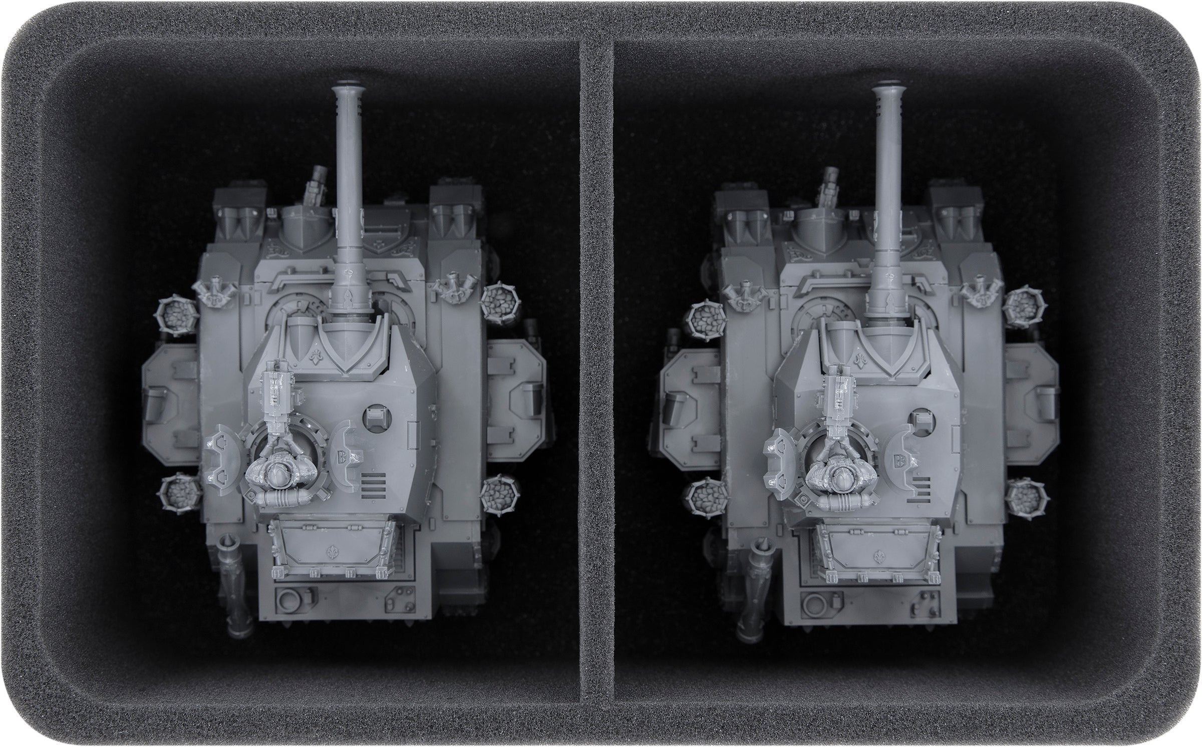This Half-Size foam mat features two large compartments, each of which will hold one Castigator miniature. You can stow the Castigator in multiple build variants into the compartments. It fits with a Castigator battle cannon or Castigator autocannons as its main weapon.