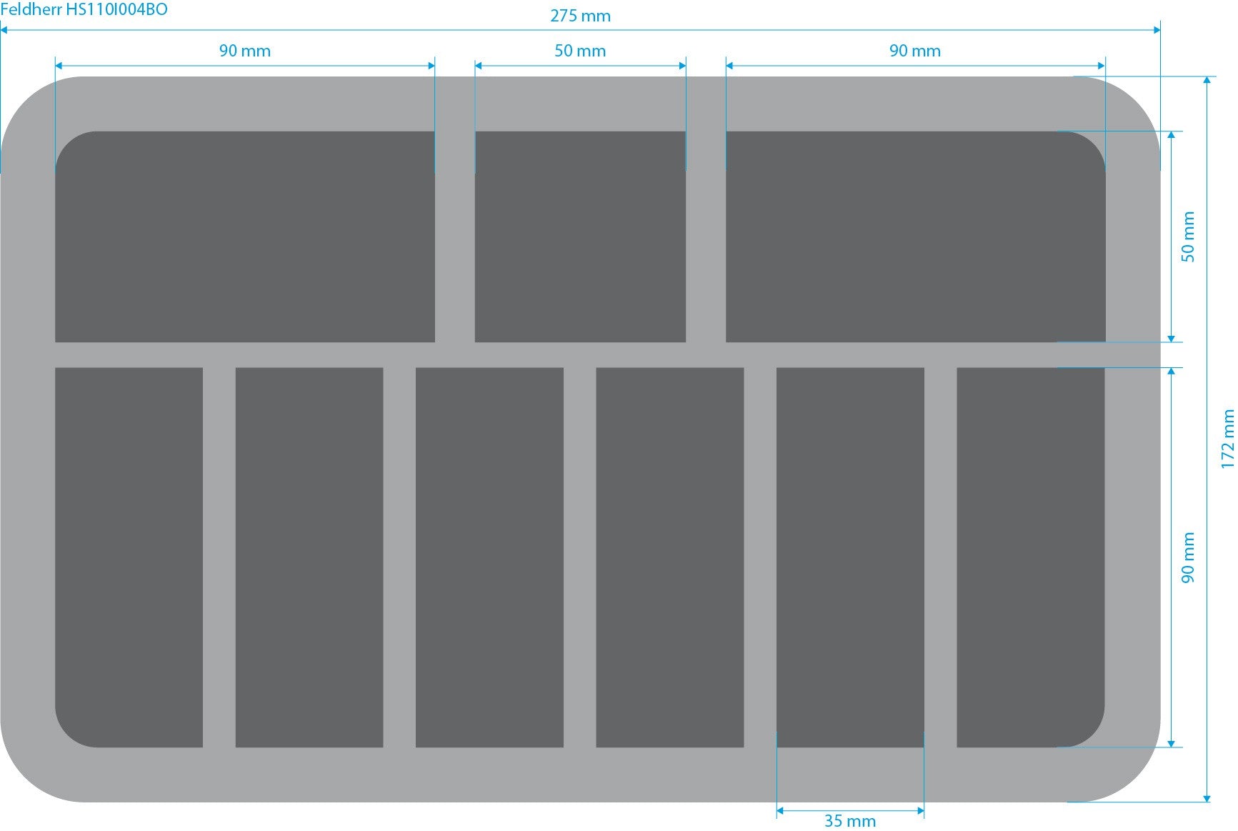 - This foam tray has the dimensions: 275 mm x 172 mm x 110 mm total height (100 mm usable height + 10 mm foam base).