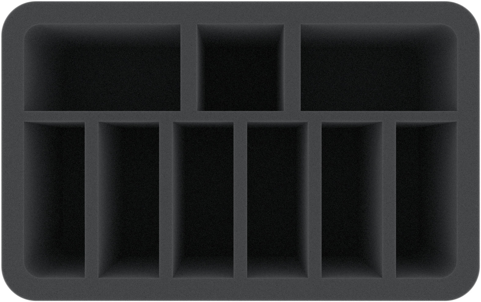 This Half-Size is divided into 9 different-sized compartments. It is optimally suited for taller and elongated tabletop and board game miniatures.