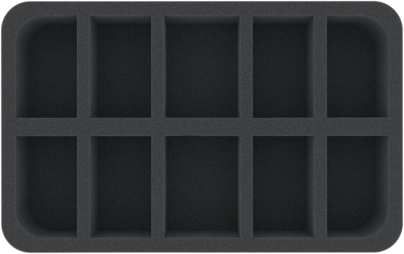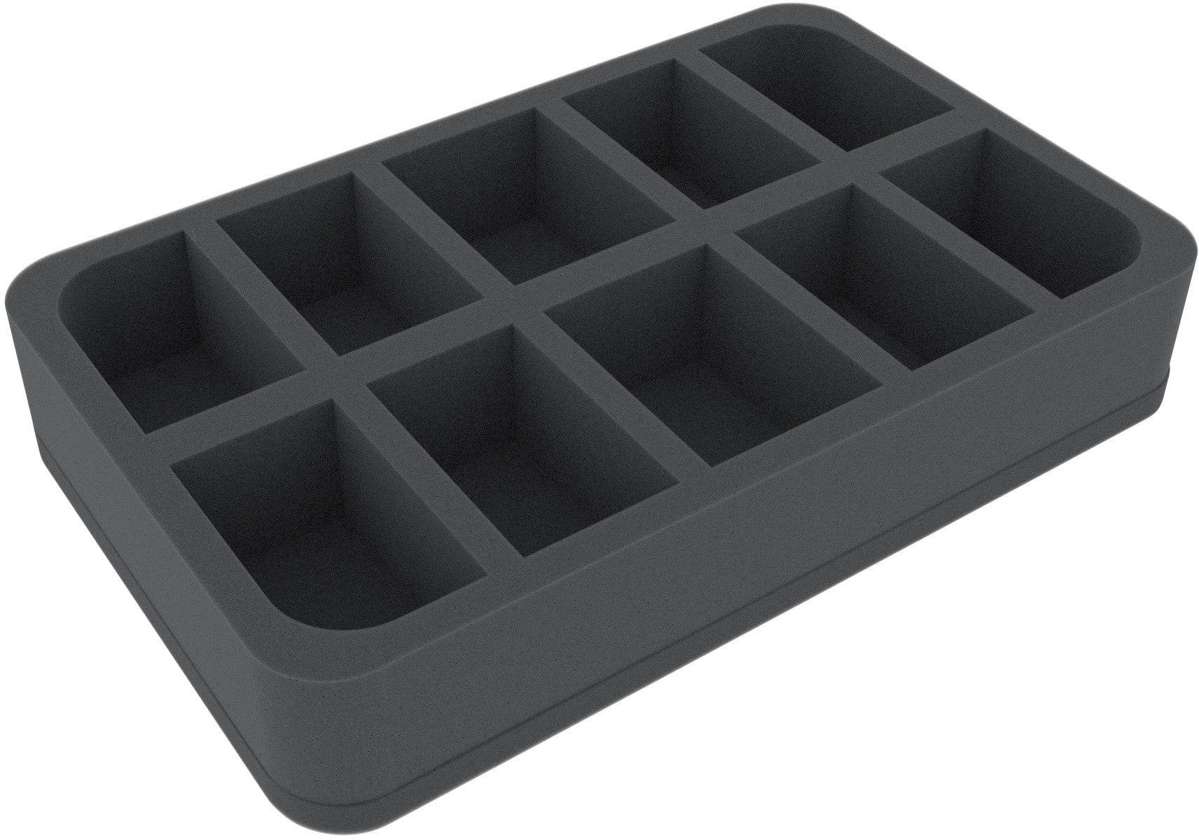Perfect for larger tabletop miniatures in 28 mm systems. This foam tray has 10 slots - each slot 50 mm deep. Ready to use - glued 10 mm foam base.