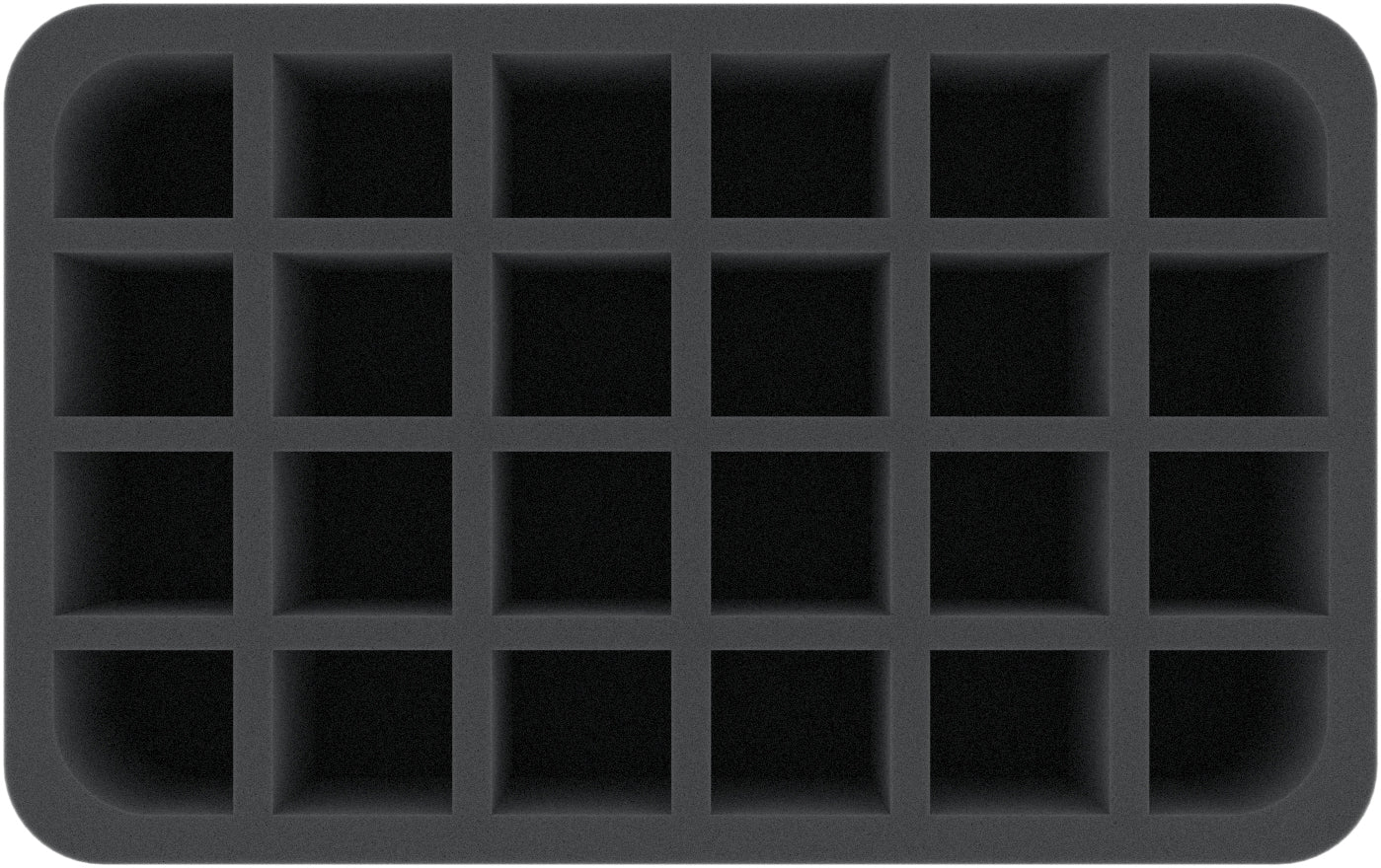 This Half-Size foam tray is divided into 24 compartments of the same size. It is particularly suitable for the safe storage of small to medium-sized figures for various board games and tabletop systems. Game material or other small parts can also be neatly stowed here.