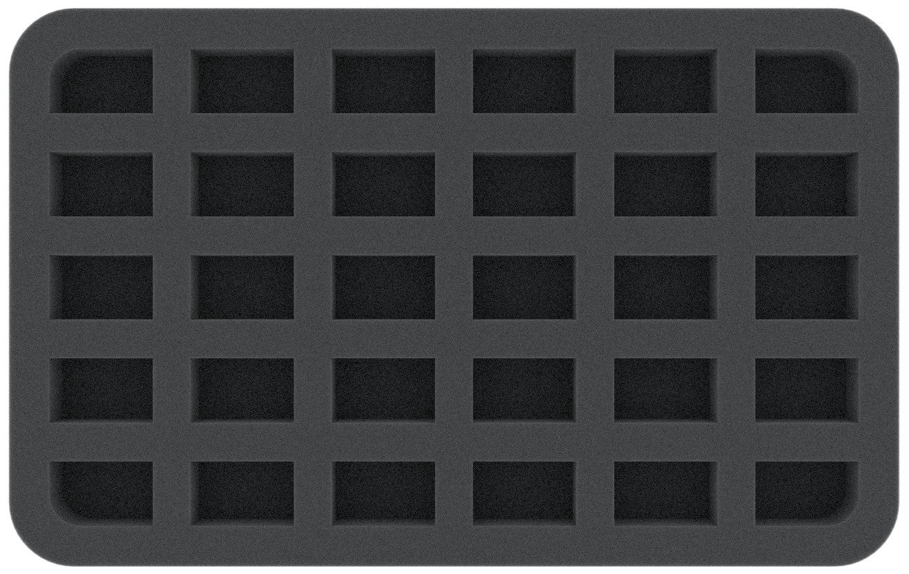 This foam tray has 30 slots - each slot 32 mm x 20 mm x 25 mm deep.