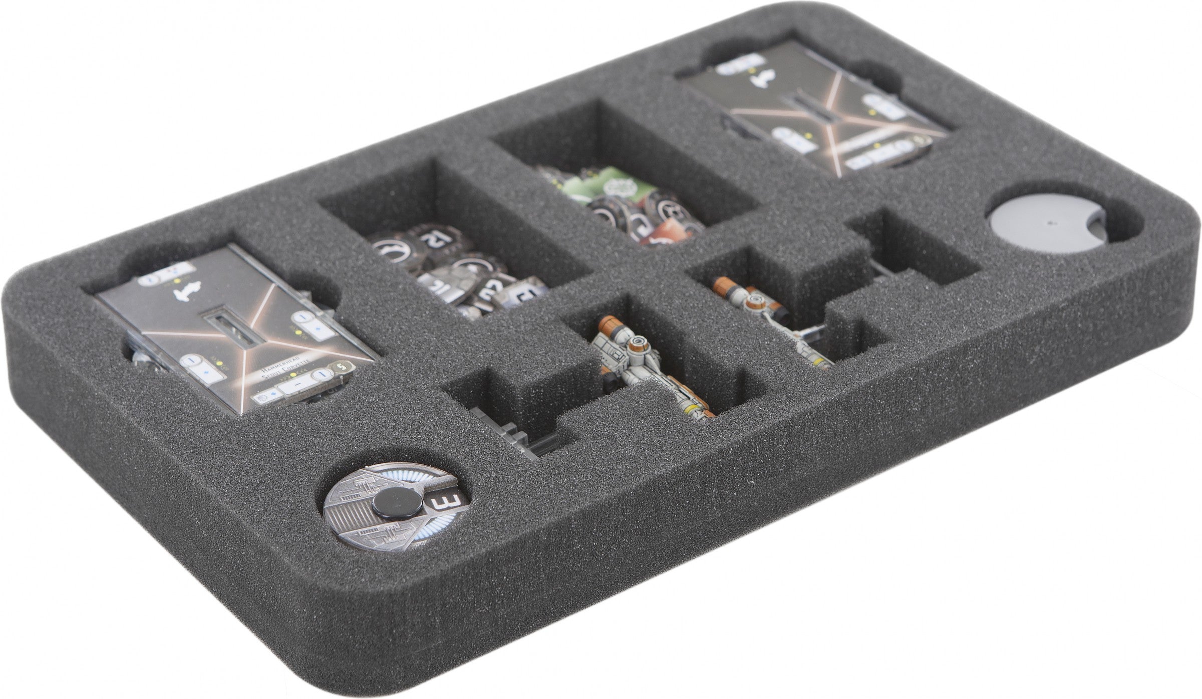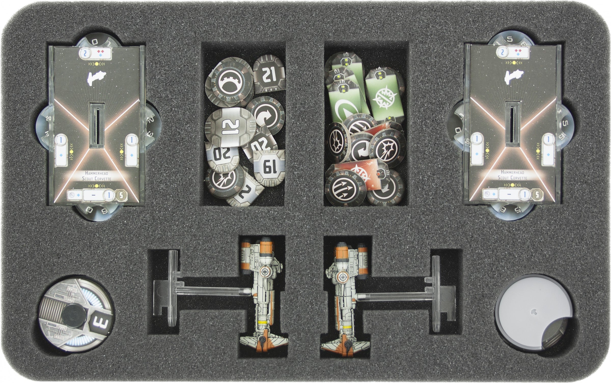 With these foam tray your Star Wars: Armada - Hammerhead Corvettes - expansion pack is save. Your both Hammerhead Corvettes with poles fit perfectly in the cut-outs. Also your bases, the Command and Speed Dials as well as the 22 tokens find a separate, suitable place.