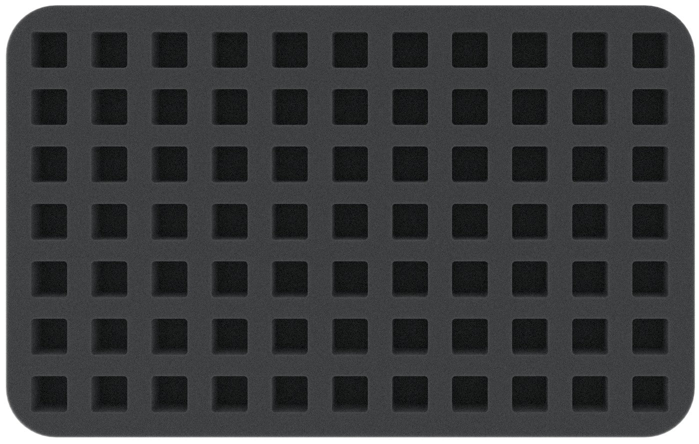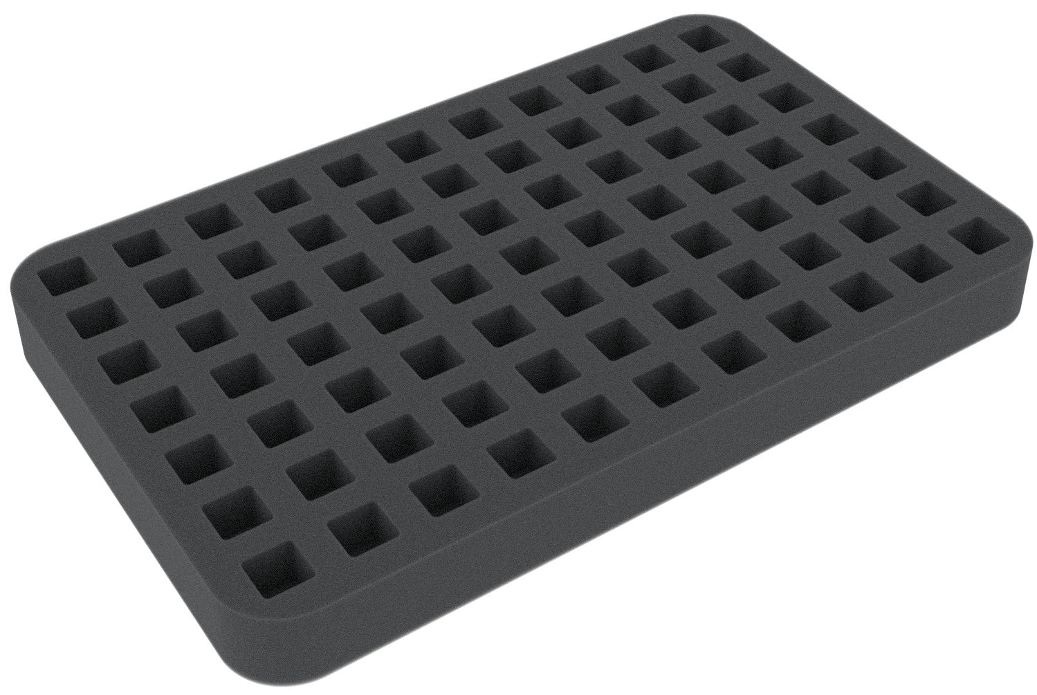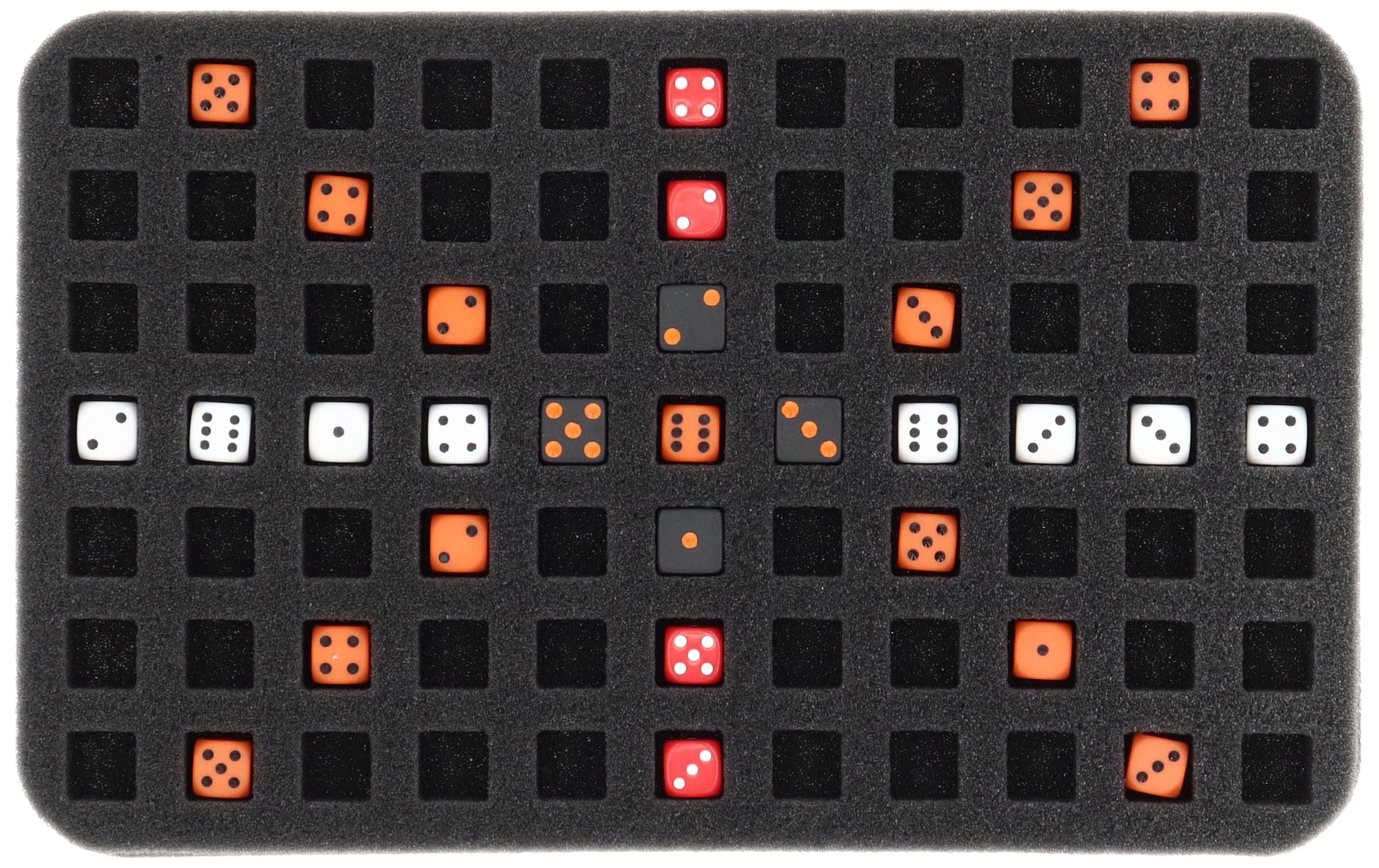 This Half-Size foam tray is divided into 77 square compartments. It is particularly suitable for the orderly storage of dice, such as D6 with 14 mm edge length.
