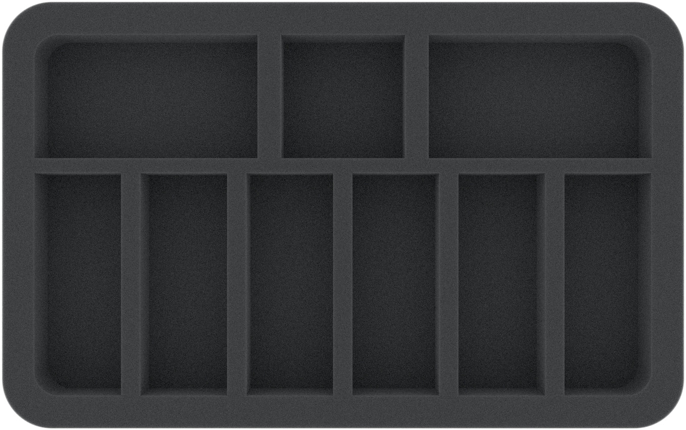 - 6 compartments: 90 mm long x 35 mm wide x 30 mm deep (2 with 1 rounded corner)