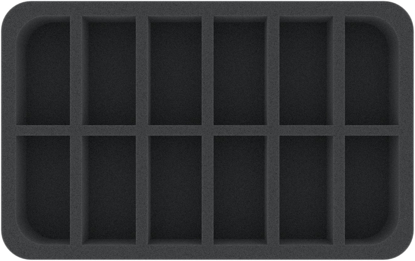 On this Feldherr foam tray normal and larger miniatures can be placed orderly and well protected. The insert has 12 compartments with 2 different sizes, which are particularly suitable for heroes or monsters from the classic tabletop games. 8 compartments have rectangular layouts. The shape of the 4 corner compartments is best seen on the pictures.