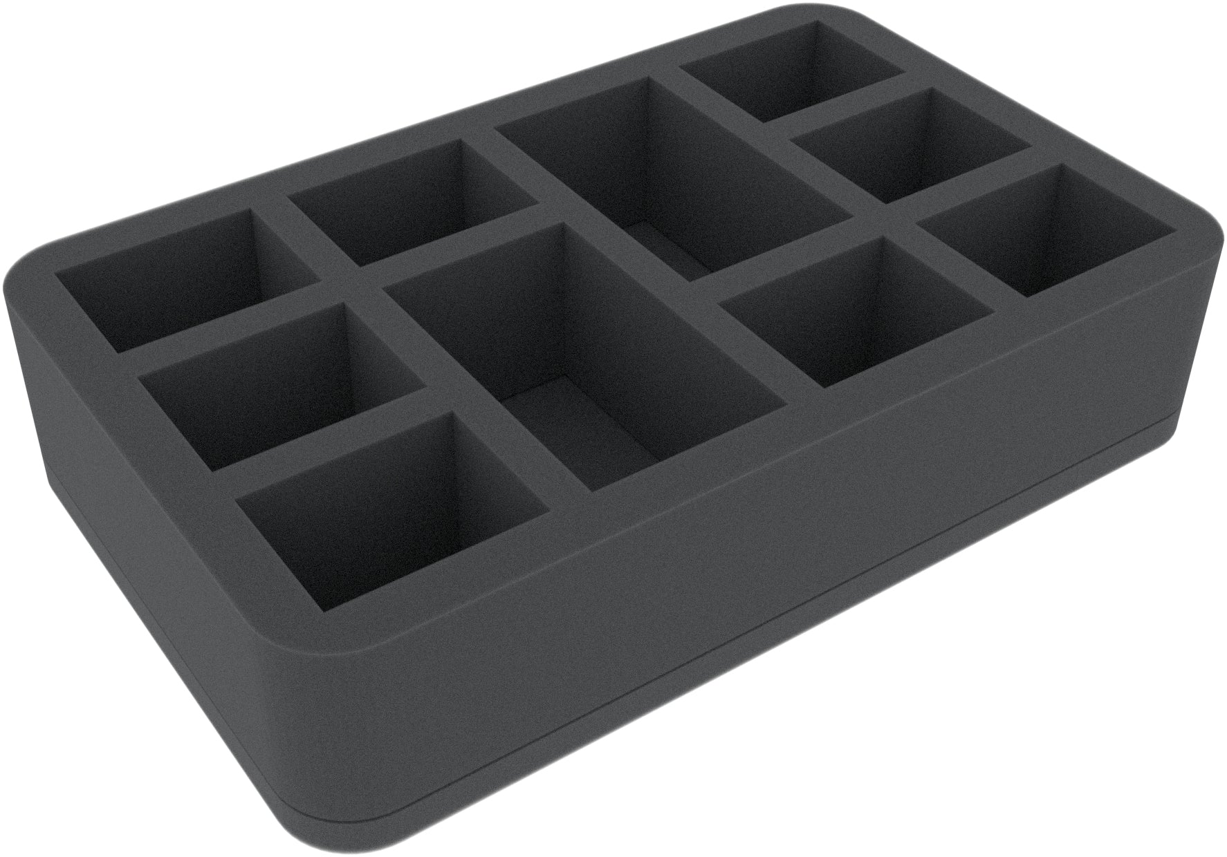 This Half-Size foam tray is divided into 10 compartments of the different sizes. It is particularly suitable for the safe storage of miniatures for various board games and tabletop systems. Game material or other small parts can also be neatly stowed here.