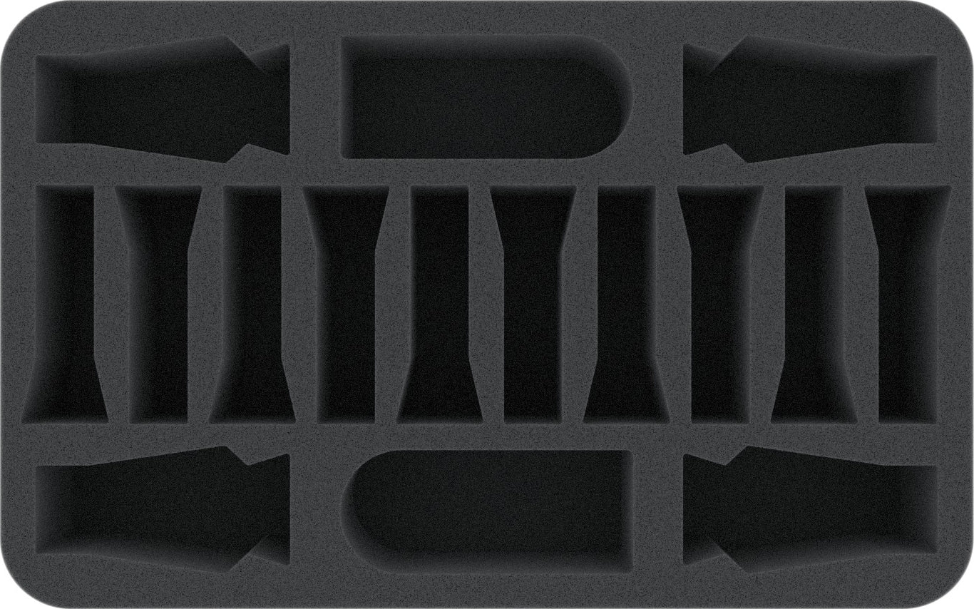 This Half-Size foam tray ensures with 16 tailor-made compartments that the plastic scenery pieces of the Kill Team: Rogue Trader box are clearly and safely stowed away. In the center of the foam mat, the bulkhead doors are lined up in 10 individual compartments. The 2 sections of pipework, just like the 4 escape pods, also have their own compartments.