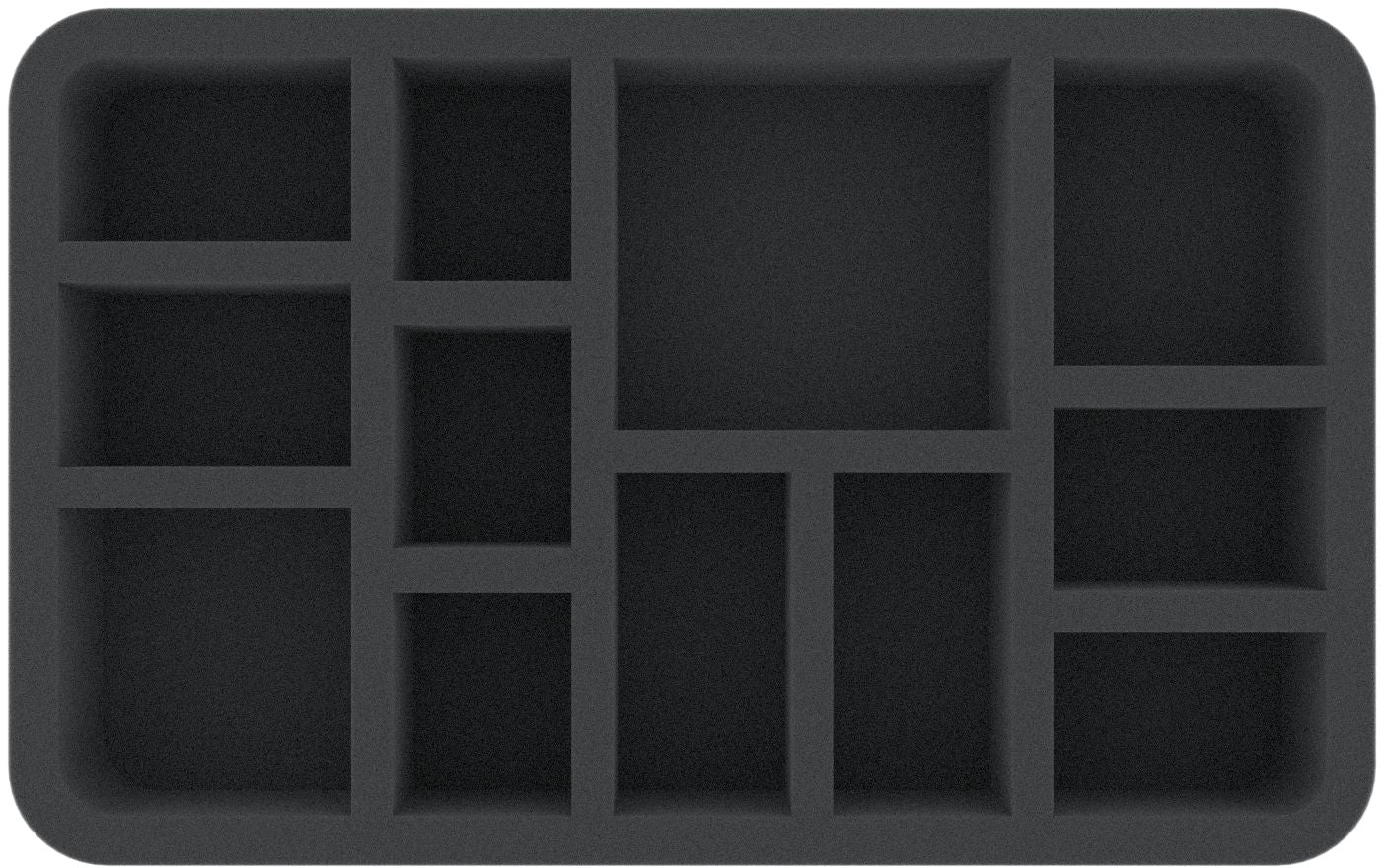 This 50 mm high foam tray is divided into 12 compartments. It is particularly suitable for the safe storage of tabletop and board game miniatures, as well as other fragile models and small parts.