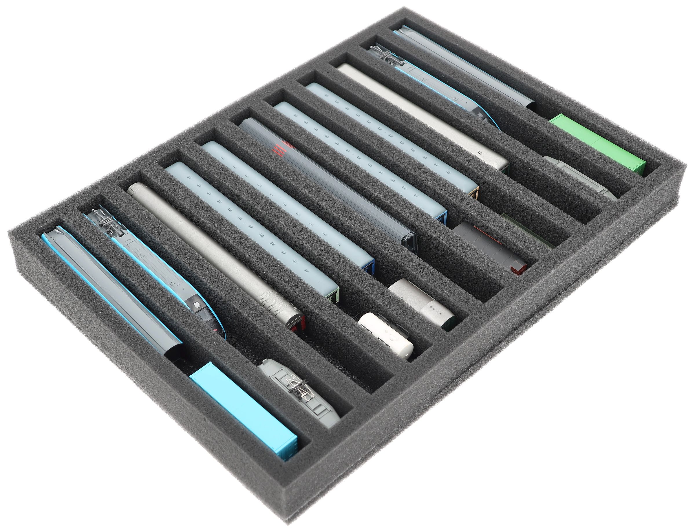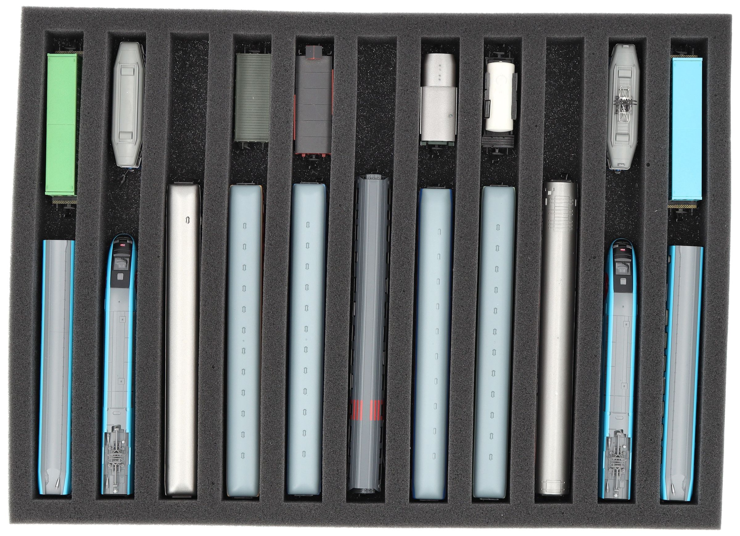 Whether for transport to exhibitions, module meetings, or safe storage on shelves at home, this insert keeps your N scale locomotives and cars reliably protected. The 11 compartments hold the models upright and shield them from bumps and scratches.