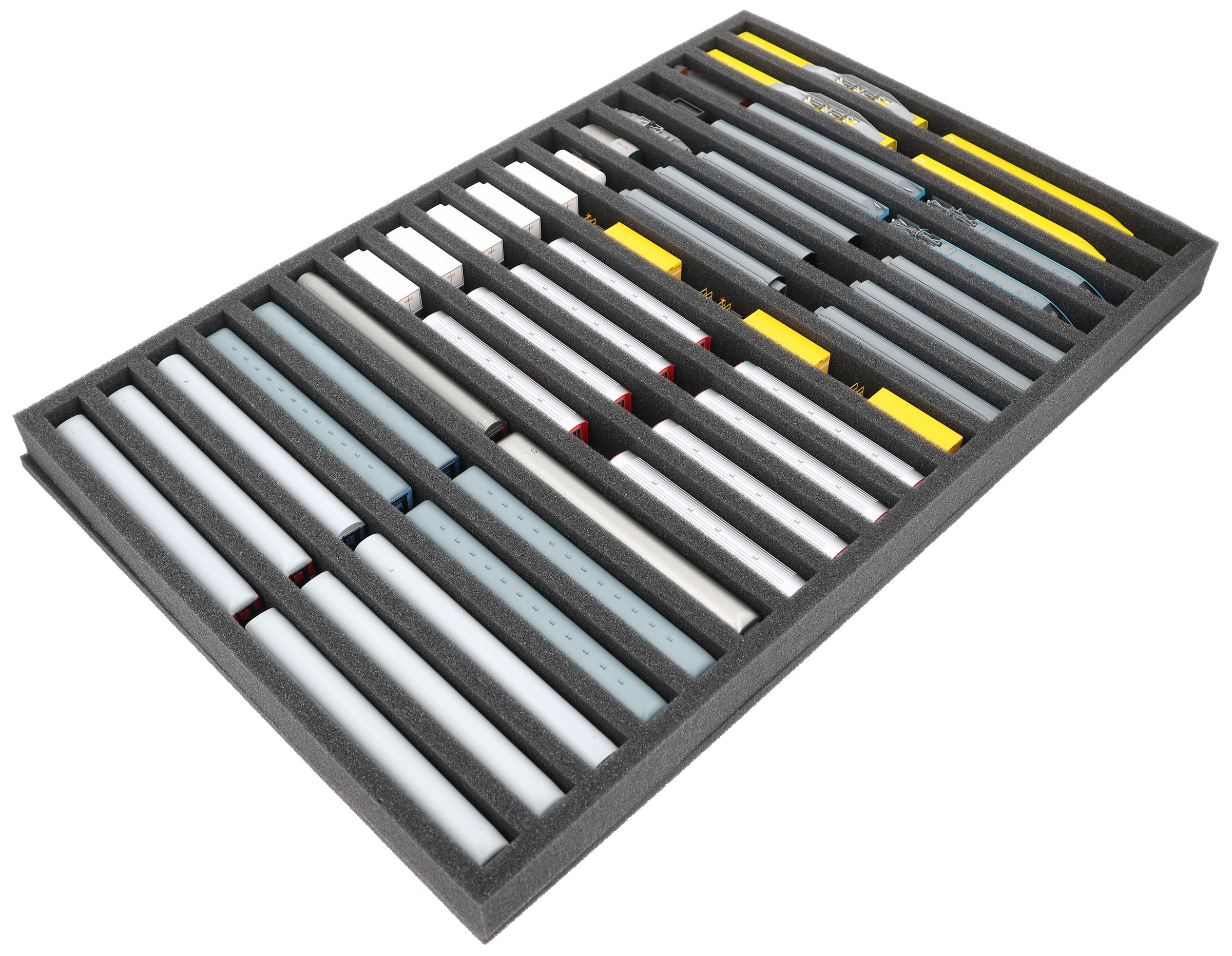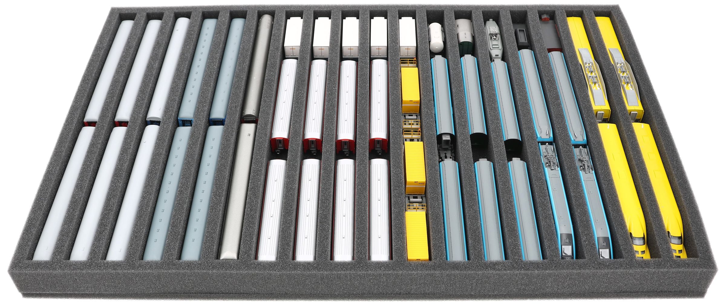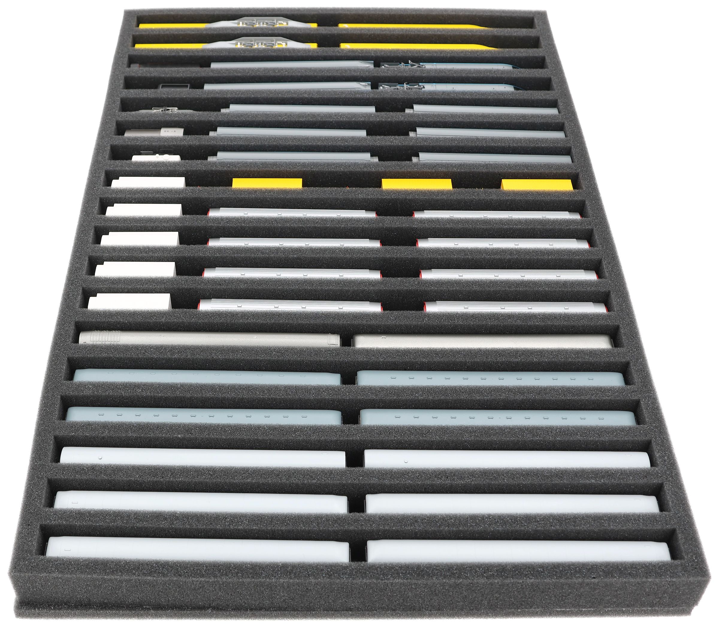 Whether for transport to exhibitions, module meetings, or safe storage on shelves at home, this insert keeps your N scale locomotives and cars reliably protected. The 18 compartments hold the models upright and shield them from bumps and scratches.