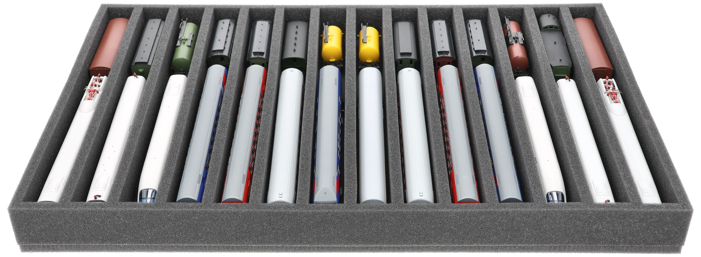 Whether for transport to exhibitions, module meetings, or safe storage on shelves at home, this insert keeps your TT scale locomotives and cars reliably protected. The 14 compartments hold the models upright and shield them from bumps and scratches.