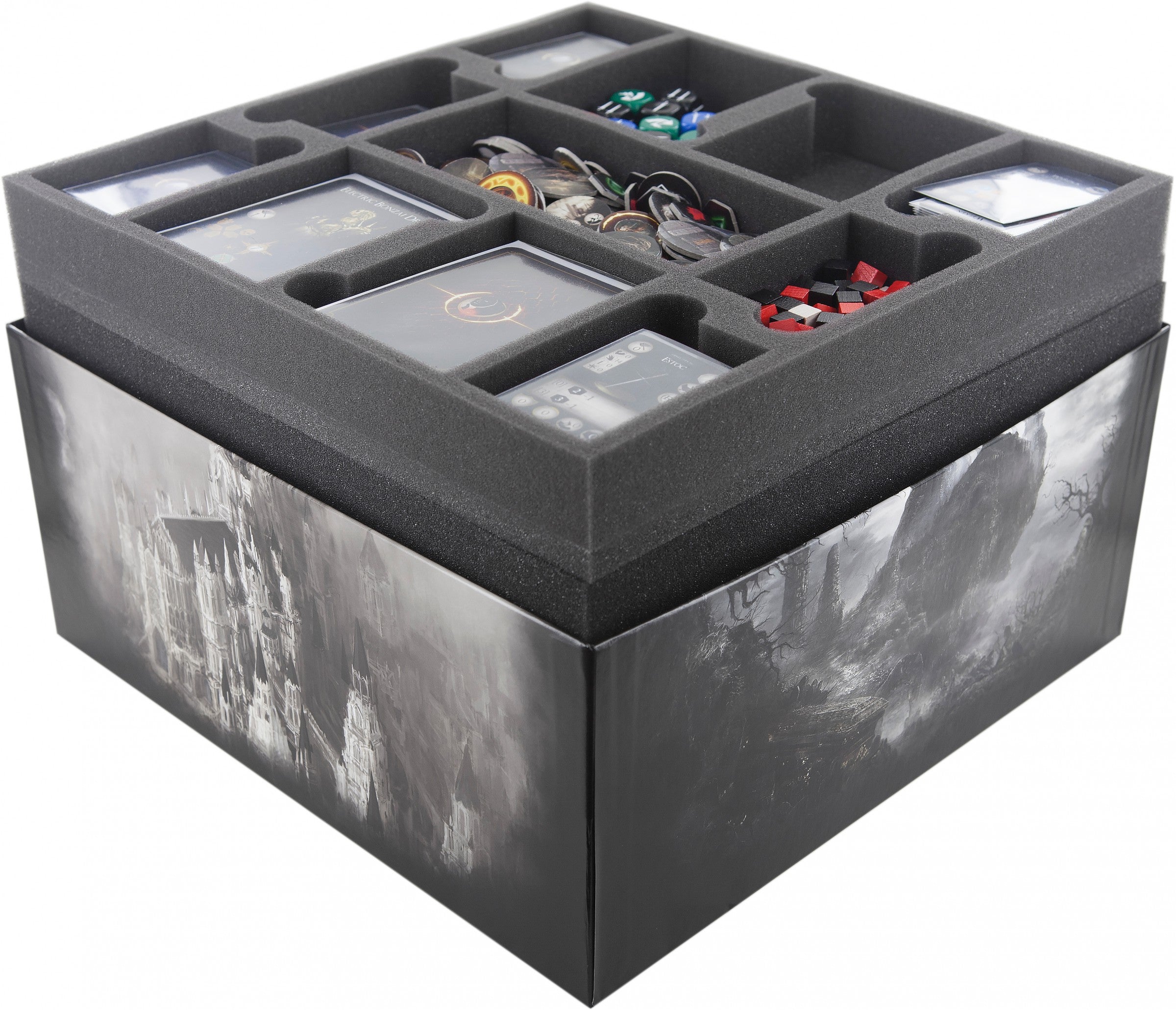 This foam set suitable for retrofitting all game content from the Dark Souls board game box. The different sized compartments are suitable for characters, enemies, bosses, markers and cards in sleeves. The foam trays fits perfectly into the original board game box, or into the Feldherr box LBBG. Foam extends over the edge of the board game box.